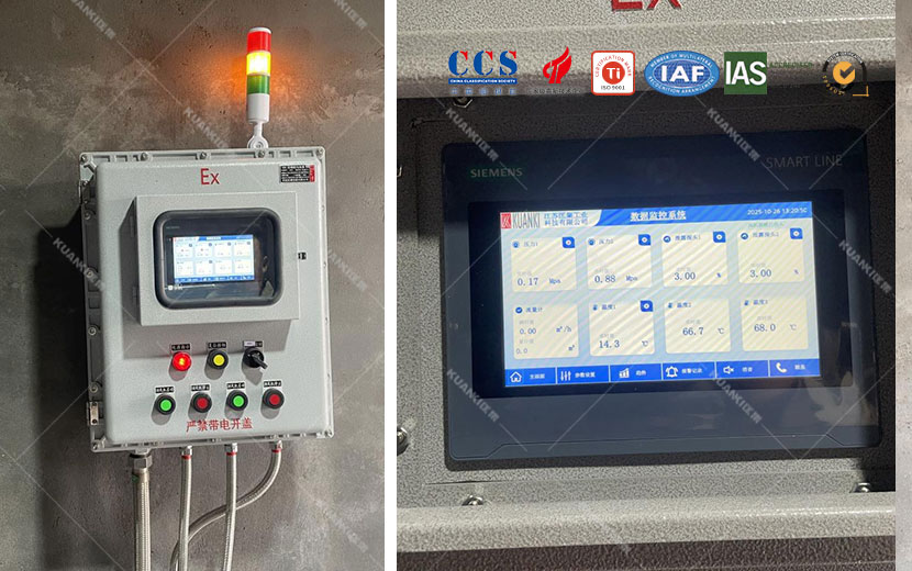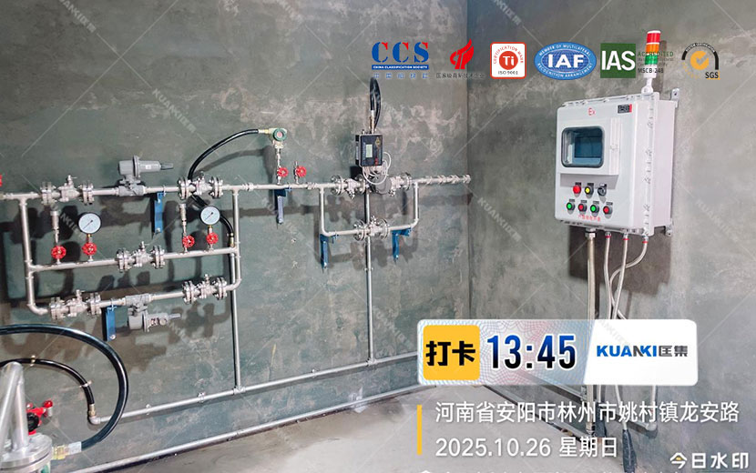 光远新材料新建丙烷气站,需要提供现场集中供气方案,经过于客户电话沟通、腾讯会议确认,从前期设计到管道布置安装都由我司提供。成套设备所用到设备分别是:丙烷汇流排、液相全自动切换、电加热水浴式汽化器、双路调压阀阀组、双路过滤阀组、浓度泄露报警系统、低压报警系统集成到PLC控制柜。丙烷系统用于后端反应釜燃烧使用。